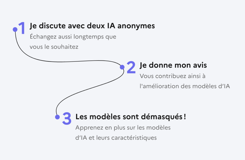 - Discussion avec deux IA : l’utilisateur se connecte à la plateforme Compar:IA et soumet une question ou un sujet à plusieurs modèles d’IAG. Par exemple, il peut poser des questions sur des sujets variés comme la culture francophone, l’actualité ou des sujets techniques.