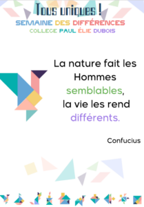 Le programme était le suivant : quelques jours avant le début de la semaine des différences, mettre en place un affichage indiquant l’organisation prochaine de « Tous uniques » et la présentation des différentes thématiques. Ensuite, chaque jour, les élèves installaient de nouvelles affiches présentant des citations en lien avec la thématique du jour.