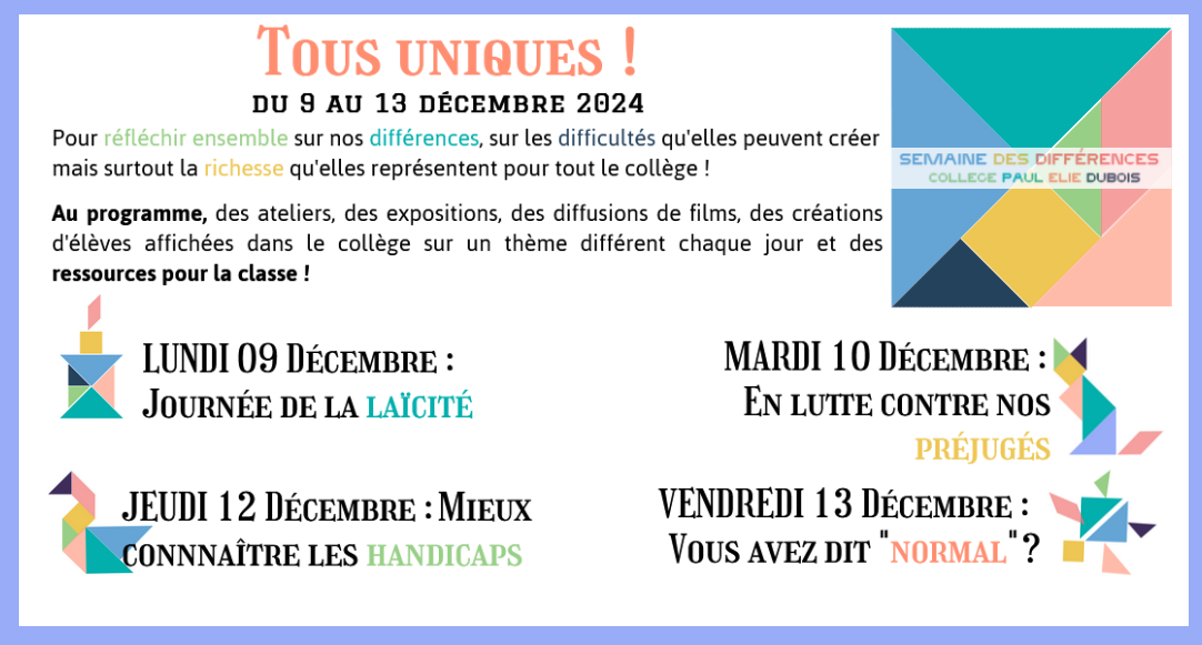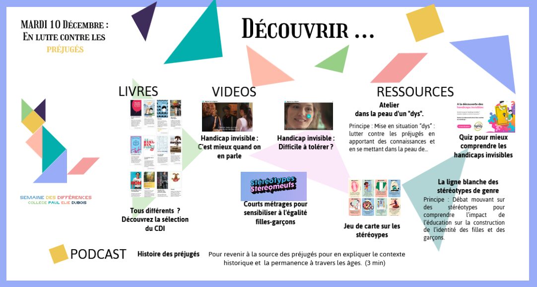 rts, mais surtout parce que la différence représente une richesse, nous avons souhaité, en tant que professeur-documentaliste et coordonnatrice de l’ULIS, initier dans notre collège un événement permettant de réfléchir aux enjeux de la différence et du vivre-ensemble.